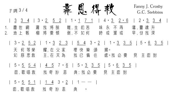 芬 妮 歌 斯 貝 因 早 年 失 明 , 非 常 愛 主 , 她 作 的 詩 歌 都 充 滿 了 對 主 的 熱 愛 , 並 渴 望 與 主 相 會 的 福 樂 , 使 我 們 唱 她 的 詩 歌 時 , 也 被 她 的 真 情 所 感 染 , 引 發 起 我 們 要 與 主 接 近 的 心 。 難 怪 在 她 逝 世 之 差 不 多 九 十 年 的 今 時 , 我 們 仍 然 喜 愛 唱 她 的 詩 。