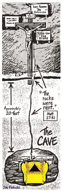 这 幅 图 标 明 在 耶 稣 被 钉 的 十 字 架 下 面 的 地 已 裂 开 , 兵 丁 拿 枪 扎 他 的 肋 旁 , 随 即 有 血 和 水 流 出 来 , 这 血 一 直 淌 入 廿 之 下 的 约 柜 施 恩 宝 座 之 上 。